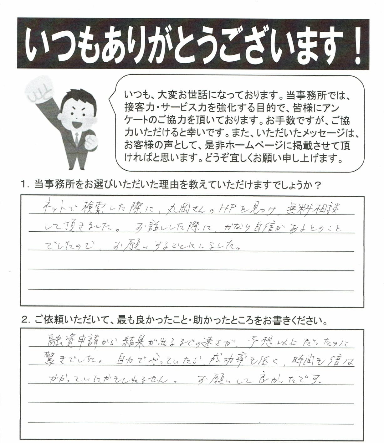 融資申請の結果が出るまでの速さが予想以上だったのに驚きでした。自分でやっていたら、成功率も低く、時間も倍はかかっていたかもしれません。お願いして良かったです。
