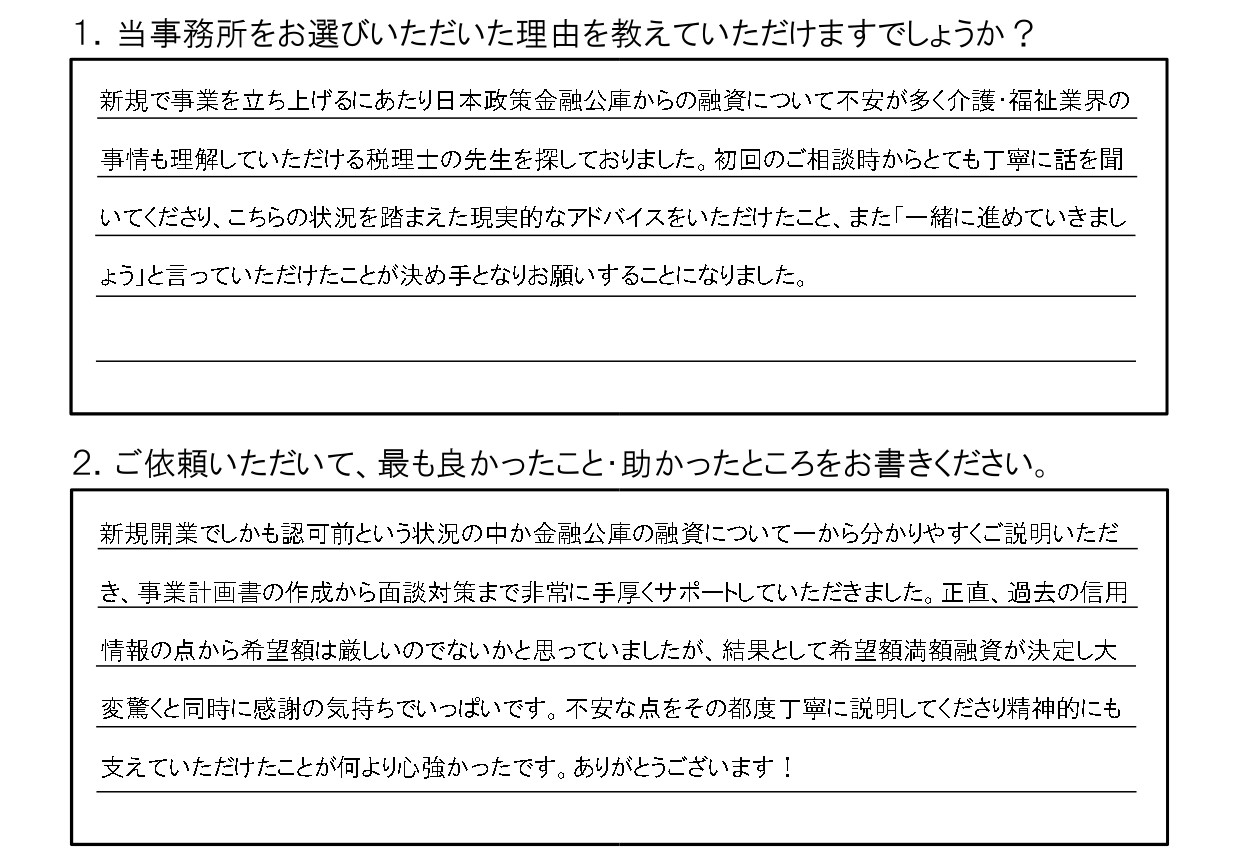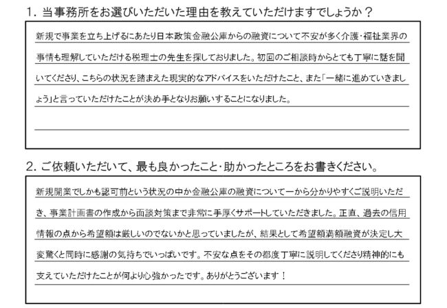 新規で事業を立ち上げるにあたり日本政策金融公庫からの融資について不安が多く介護・福祉業界の事情も理解していただける税理士の先生を探しておりました。初回のご相談時からとても丁寧に話を聞いてくださり、こちらの状況を踏まえた現実的なアドバイスをいただけたこと、また「一緒に進めていきましょう」と言っていただけたことが決め手となりお願いすることになりました。